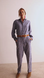 Long-sleeved jumpsuit crafted from a super-soft stretch denim-look fabric with a subtle floral print. The front fastening features brown buttons hidden under a placket for a clean, understated finish. The elastic waistband at the back provides a snug fit and added comfort. Side pockets.