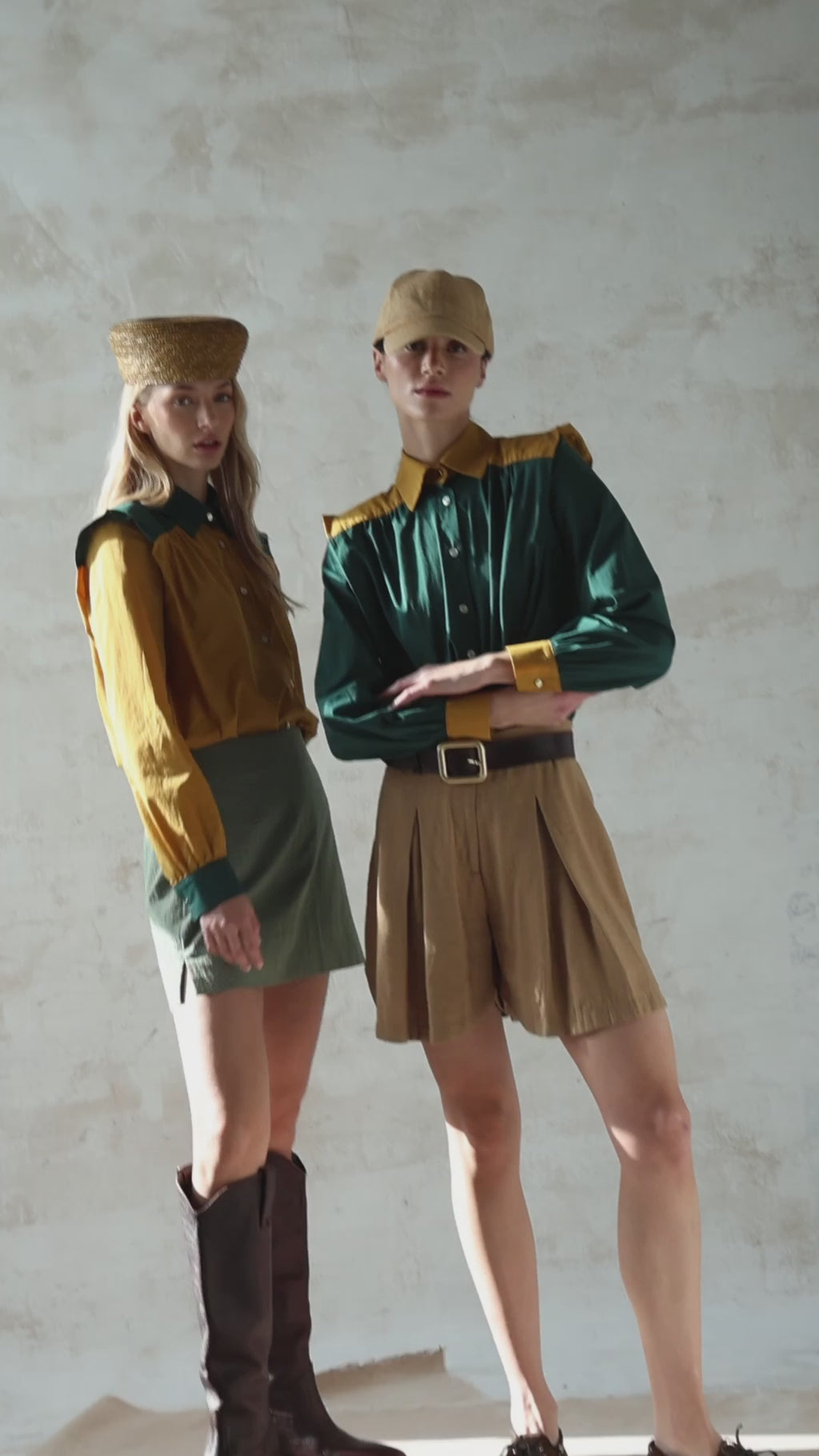 Nuestra icónica camisa reinterpretada en una combinación de color mostaza con detalles en verde en cuello, canesú y puños que aportan contraste y personalidad. Con botones de nácar en la parte frontal y botón dorado en cuello y puños. Detalle de volado en el hombro que aporta estructura estilizando la silueta. Hombreras removibles.