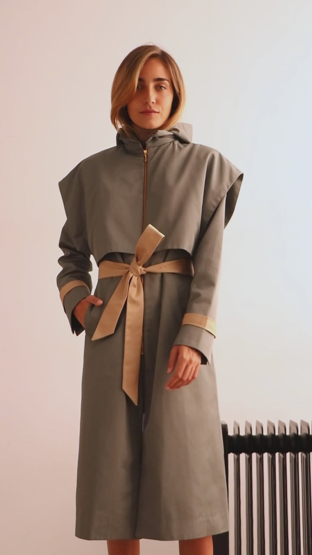 Trench impermeable confeccionado en tejido mezcla. El cuello puede llevarse como cuello alto o en solapa. Bolsillos laterales. Cinturón lazada y trabillas en puños en color a contraste. Cierre frontal con cremallera dorada vista. Forro en tejido de algodón unicolor para mayor confort.
