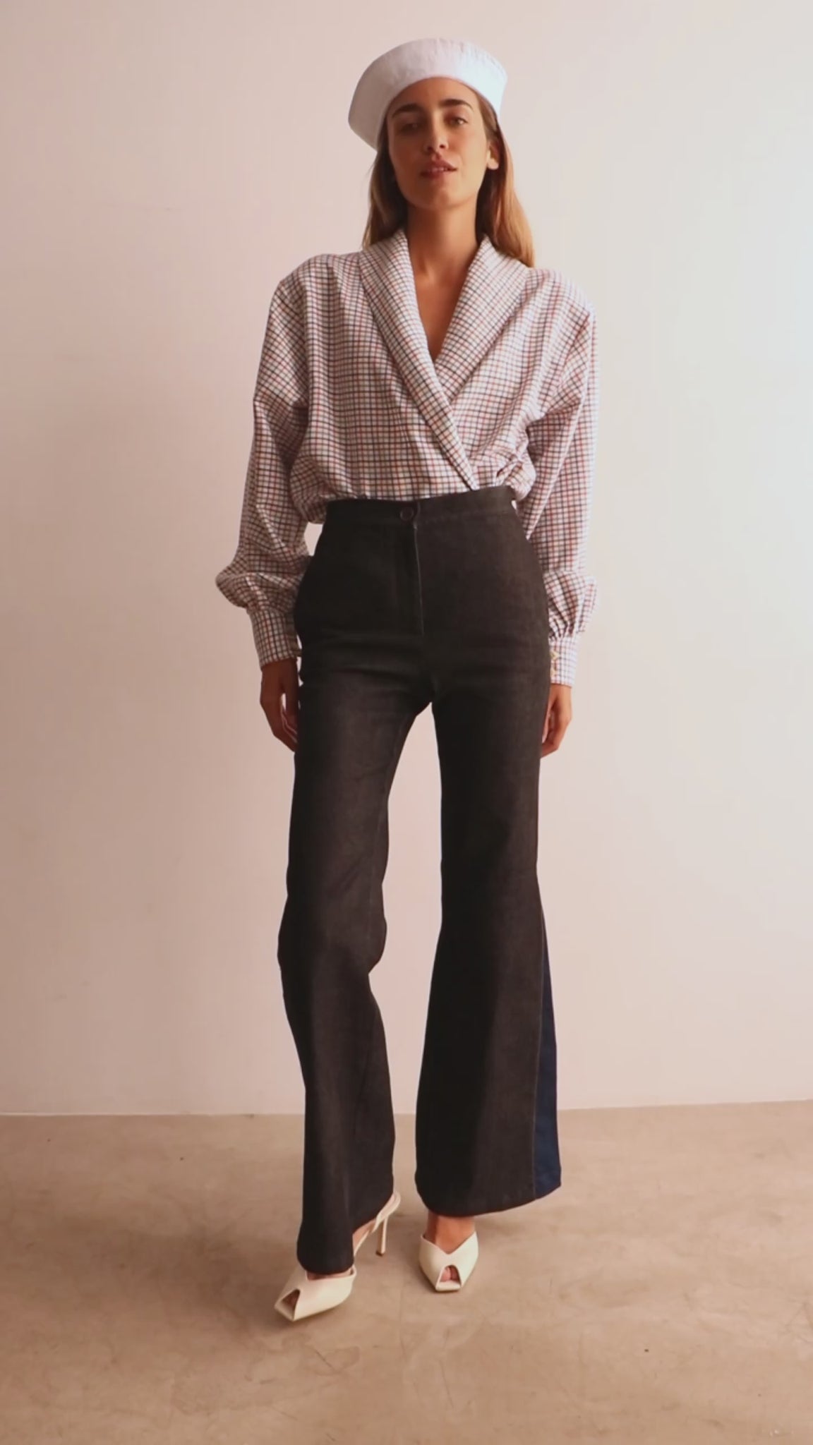 Pantalón de talle alto en tejido denim elástico de grosor medio. Ceñido en la parte superior y bajo acampanado con la característica cuña lateral de Julise Magon en azul marino. Con bolsillos laterales. Cierre frontal con botón y cremallera.